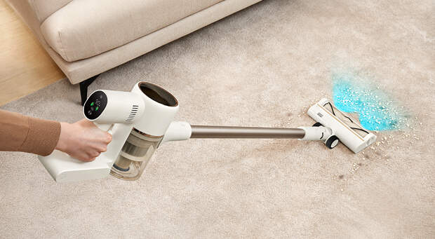 Беспроводной вертикальный пылесос Dreame R10S Aqua сочетает функции сухой и влажной уборки и подходит для различных типов поверхностей. Насадка с вращающимися швабрами и резервуаром 200 мл позволяет поддерживать постоянное увлажнение и удалять стойкие загрязнения.
