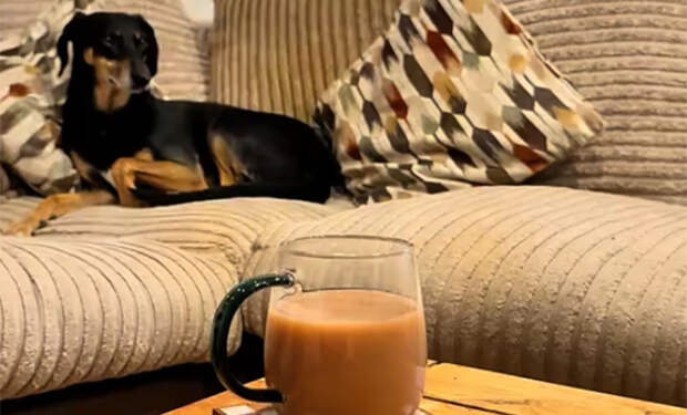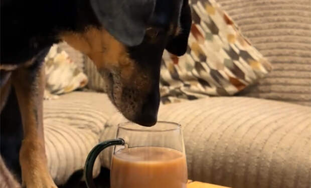 Собака спрыгнула с дивана, метнулась к журнальному столику и уверенно потянулась мордой к кружке. На видео заметно, как собака делает несколько быстрых глотков, затем замирает и внимательно смотрит в сторону двери, будто прислушивается, не возвращается ли хозяйка.