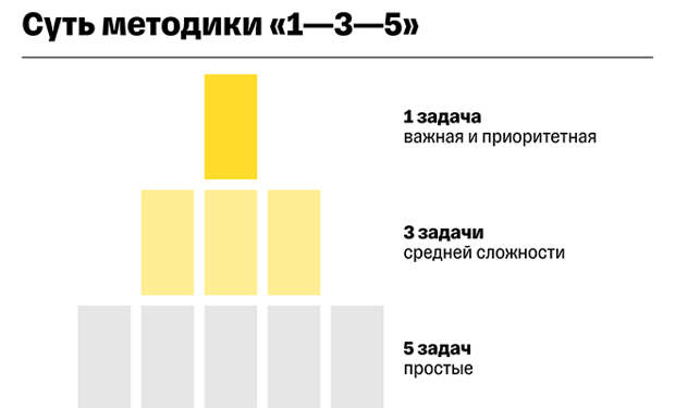Распишите одну большую, три средние и пять маленьких задач, а затем перенесите подход на неделю, месяц или год. Вы можете использовать этот шаблон даже для долгосрочных горизонтов, подменяя ежедневные дела крупными этапами проектов.