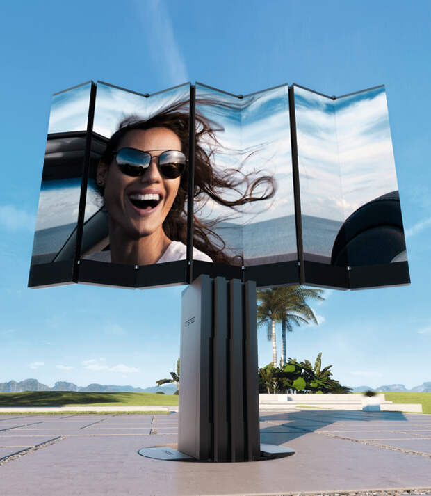 Его фишка — полностью автоматическая конструкция. В неактивном состоянии телевизор скрыт под землей, а при включении поднимается вертикально на семиметровой стойке. Затем экран из семи алюминиевых панелейплавно разворачивается и соединяется в единое полотно диагональю 201 дюйм — это больше, чем у большинства домашних проекторов.