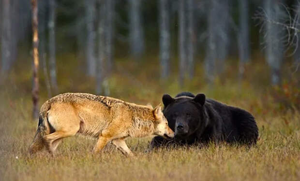 В Финляндии, где серые волки находятся на грани исчезновения, а бурые медведи строго охраняются, такой природный союз стал символом адаптации. Несмотря на принадлежность к разным видам, эта пара демонстрирует уровень доверия, который редко встречается даже внутри одной стаи.