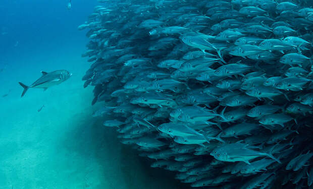Косяки анчоусов и сардин движутся почти идеально синхронно, образуя серебристые вихри, которые сбивают с толку хищников. Такое поведение помогает стае выглядеть как единое целое, без уязвимых границ. Однако иногда одна или две рыбы внезапно разворачиваются и плывут в обратную сторону.