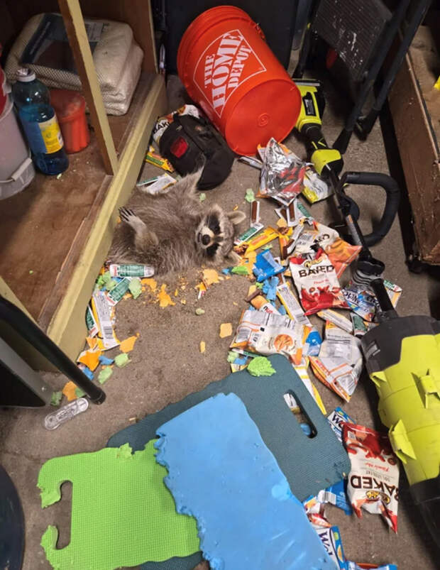 Позже выяснилось, что зверек попробовал буквально все, что хранилось в гараже: от консервов и печенья до сладостей. В какой-то момент енот уронил часть еды под нижнюю полку, полез за ней и застрял. Гаррет не стал тревожить обжору — просто поставил рядом миску воды. К утру зверек оправился и ушел обратно в лес, оставив после себя погром и миллионы улыбок в интернете.