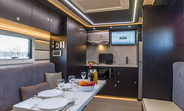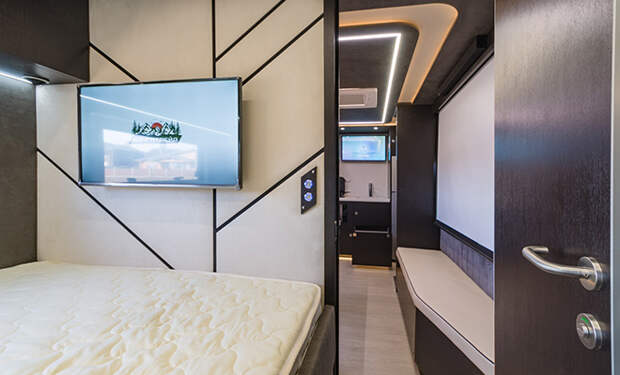 Внутри — сплошное удивление. Просторная кухня с плитой и глубокой раковиной, гостиная с настоящим камином и проектором, отдельная спальня с ортопедическим матрасом и телевизором. Шесть спальных мест позволяют разместить целую команду, а оружейный сейф добавляет практичности для любителей охоты. Интерьер оформлен в теплых тонах, и по ощущениям это уже не грузовик, а уютный загородный дом.