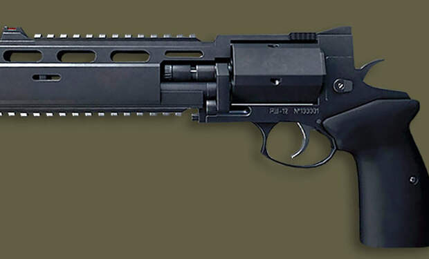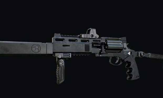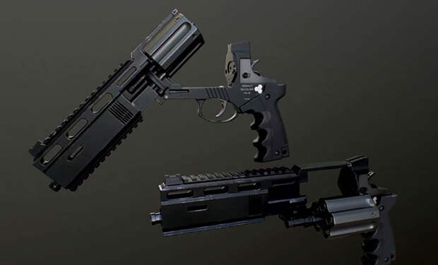 Револьвер смотрится как гибрид короткой винтовки и ручного тарана. Барабан откидывается влево, но точная система перезарядки скрыта: эксперты сходятся в одном — револьвер сделан так, чтобы не тратить секунды на перерывы, будь то съемный барабан или кассетная зарядка.