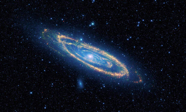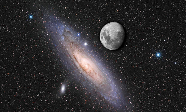 Эта гигантская спиральная галактика находится всего в 2,5 миллионах световых лет от Земли — по космическим меркам совсем рядом. Внутри нее триллион звезд, почти в несколько раз больше, чем в Млечном пути. Самые яркие из них живут в центре, окраины же выглядят гораздо спокойнее. Даже подсветка лишь основной части делает галактику потрясающе массивной: если учесть все ее звезды, Андромеда могла бы закрыть участок ночного неба, равный сорока Лунам. Но в реальности такое сияние невозможно — для этого большинство звезд должны были бы превратиться в сверхновые.