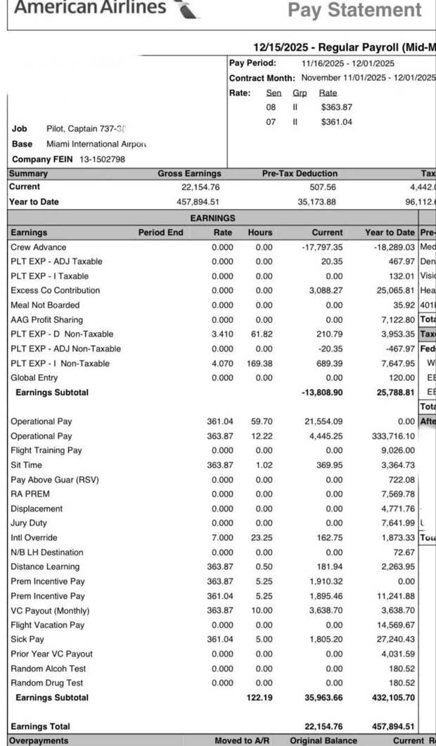 Судя по документу, за неполный 2025 год (данные по состоянию на середину декабря) общая сумма выплат капитана составила впечатляющие 457 894 доллара до вычета налогов. Это не просто «хорошая работа», это доход, который ставит пилота в один ряд с топ-менеджерами крупных корпораций и ведущими хирургами.
