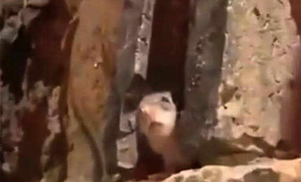 Вдруг камера смещается — и в каменной кладке появляется крошечная мордочка грызуна. Крыса спокойно выглядывает наружу, будто наблюдая за туристами, и на мгновение словно позирует перед камерой.