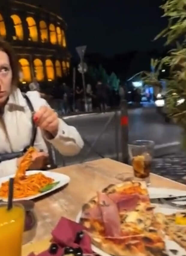 На кадрах видно, как девушка сидит за столиком с тарелкой пасты и бокалом сока, а за её спиной сияет Колизей.
