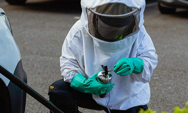 Поэтому специалисты выходят на задания в герметичных костюмах, напоминающих скафандры.На видео, снятом очевидцами, видно, как крупные шершни кружат над человеком в зеленом защитном костюме. Несмотря на опасность, специалист спокойно подносит пропитанную смесью палку к улью и наносит вещество точечно. Через несколько минут движение насекомых замирает, и улей можно безопасно снять.