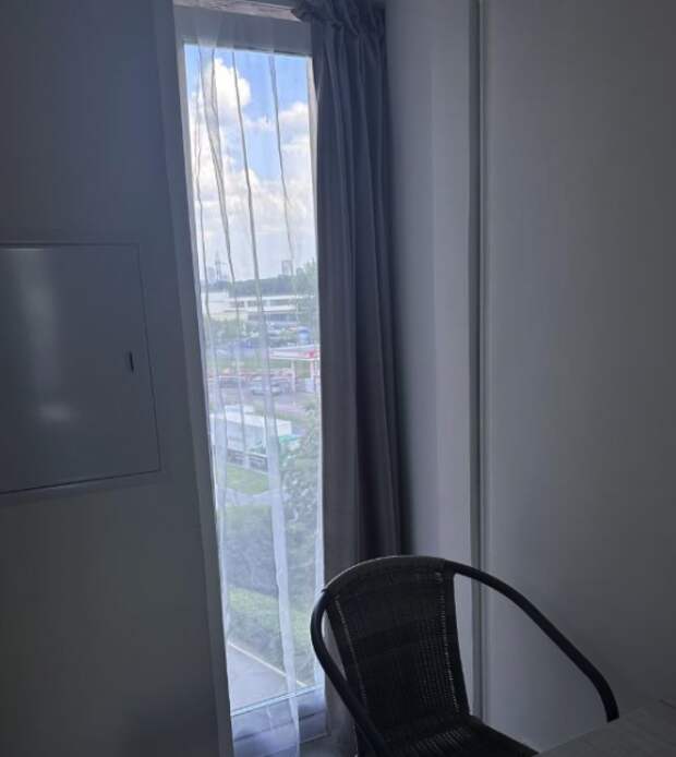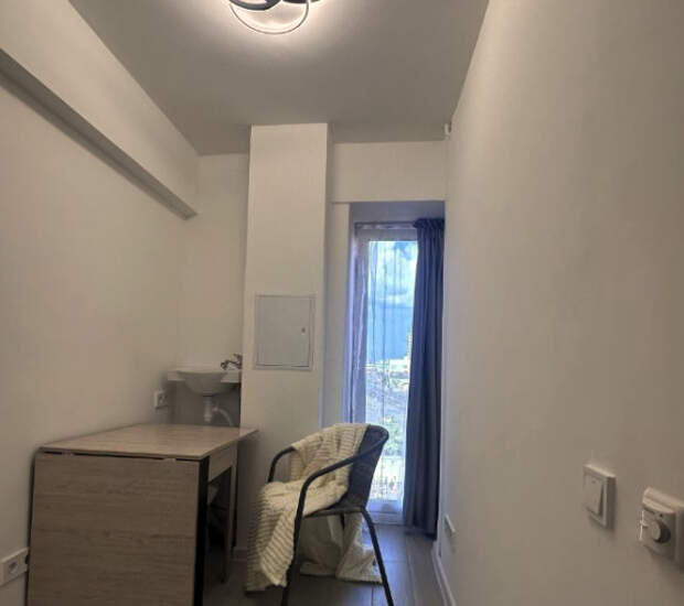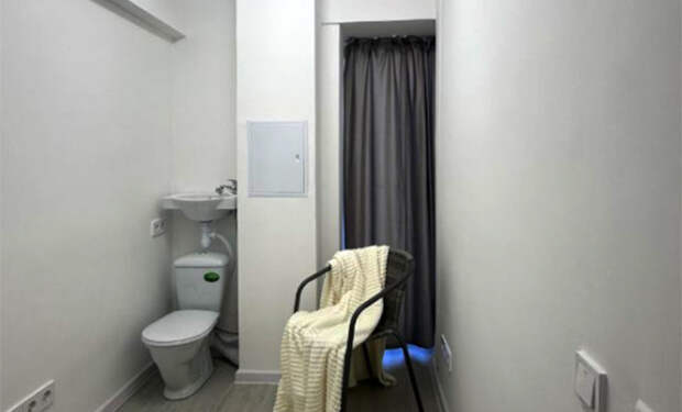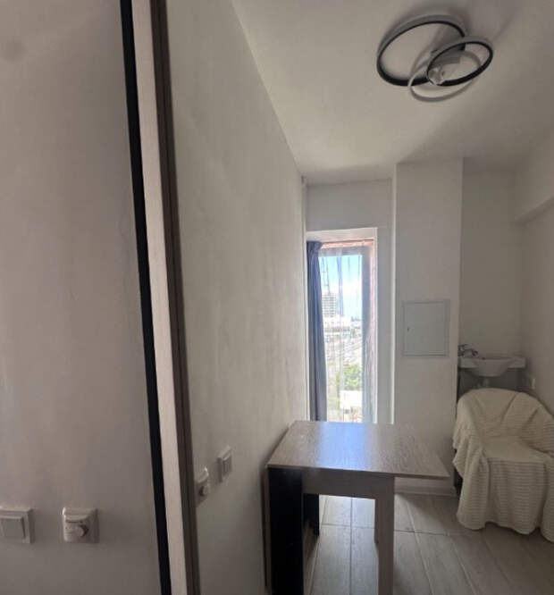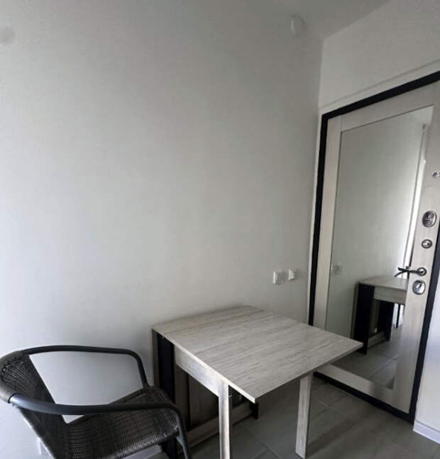 Потолки здесь высотой 2,7 метра, а на полу установлен подогрев. В объявлении жилье назвали «студией-трансформером» и отметили, что это «уникальное предложение для ценителей минимализма».Интерьер выполнен в светлых тонах: белые стены, серый ламинат и минимальная мебель не только создают ощущение чистоты, но и подчеркивают тесноту. У входа — зеркало во весь рост, рядом розетки и крючки для одежды. В углу — мини-раковина и унитаз, отделенные от жилой зоны лишь визуально.