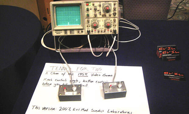 Хигинботэм, работавший в Лос-Аламосе над системой управления электронными приборами для атомной бомбы, в 1958 году неожиданно решил развлечь гостей научной выставки. По его словам, он хотел «оживить атмосферу» и показать, что наука может быть не только опасной, но и интересной. Так появился «Теннис для двоих» — первая в мире видеоигра.