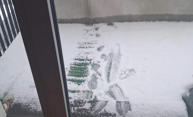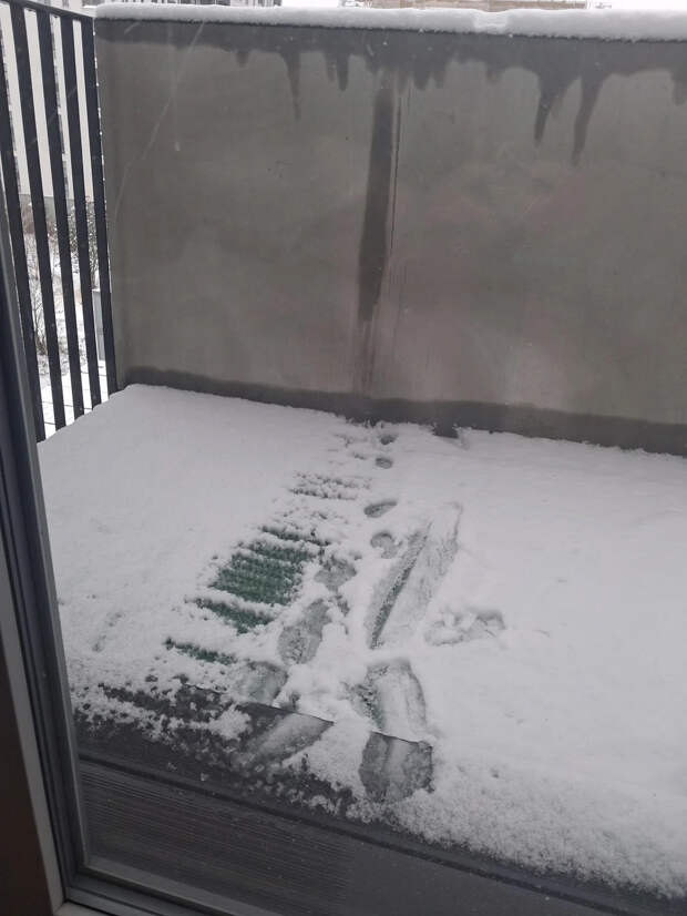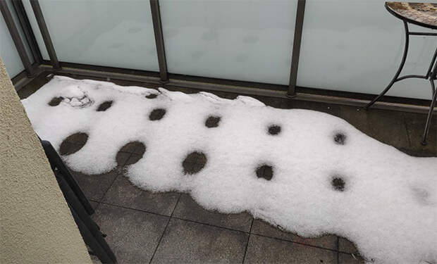 Парень на Reddit рассказал, что несколько дней не выходил на балкон из-за снега, а когда решил проверить обстановку, увидел на ровном заснеженном слое четкие длинные отпечатки, напоминавшие следы обуви. Мужчина живет на седьмом этаже, дверь весь этот период была закрыта, поэтому находка его откровенно напугала, однако в комментариях быстро выяснили «автора» следа.